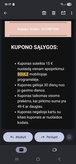 Gal kam aktualu- soulz.lt 15 eurų nuolaidos kodas perkant už 49 eurus ir daugiau. Parašykite, jei pasinaudosite, kodas vienkartinis :)